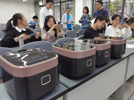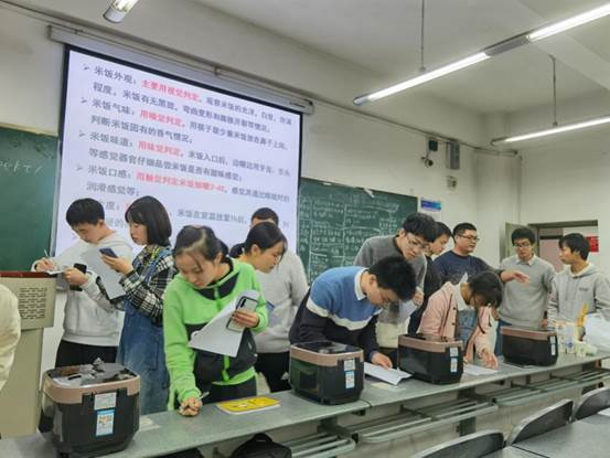 课堂上,涂斌用高产型组合F优498、优质组合K3/R583、920A/R91等四个选育品种,从大米外观、营养物质组成、香味物质的种类、基因如何影响品质以及如何品鉴大米,给同学们做了详细的介绍。同学们认真品尝了不同种类的米饭,并根据标准做了评价。