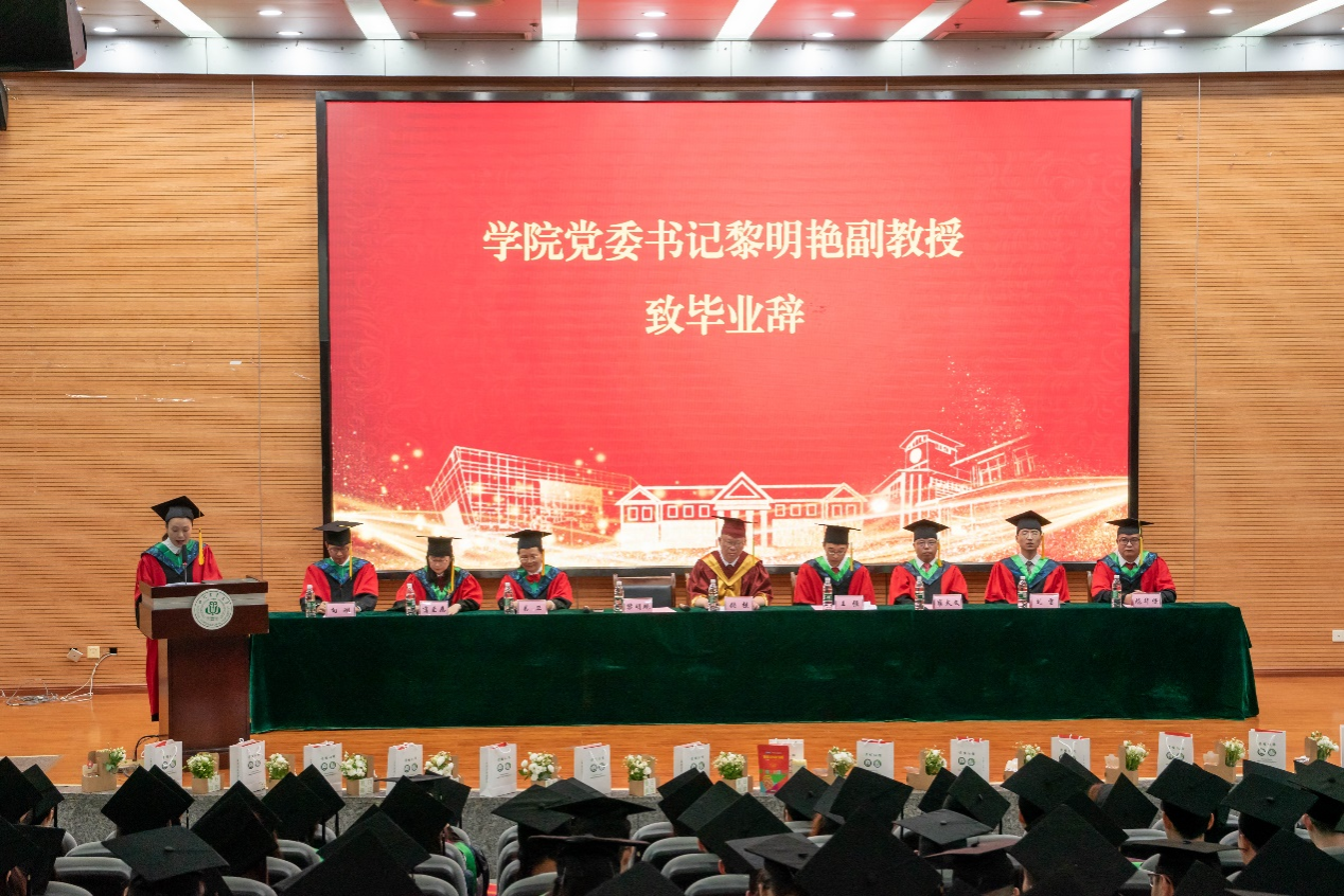 庄严的国歌齐唱拉开了毕业典礼的序幕。黎明艳上台致毕业辞,代表jlnnianhui官方网站向顺利完成学业的2023届所有本科生表示祝贺和祝福,并向老师们致以衷心的感谢和崇高的敬意。黎明艳指出,同学们在走出校门后,应只争朝夕,接续奋斗。对于未来的征途,她分享了六点体会:用自我能力的提升来应对百年变局,不去奢求合理与美好,在与不确定性斗争的过程中获得成长;用小我融入大我的家国情坚守百年梦想,厚植爱农本领,在乡村振兴的大舞台上建功立业;用“川农大精神”传承兴农使命;以创新之力谋未来,保持勇于探索不甘平庸的精神;要以热爱之名助力乡村振兴;以感恩之心对待生活。“时代和行业将赋予你们无限的可能,希望你们扎根农村,创造自己的一片天地。”黎明艳叮咛,“同学们,未来的路还很漫长,唯有感恩之心,才能走得更远。”