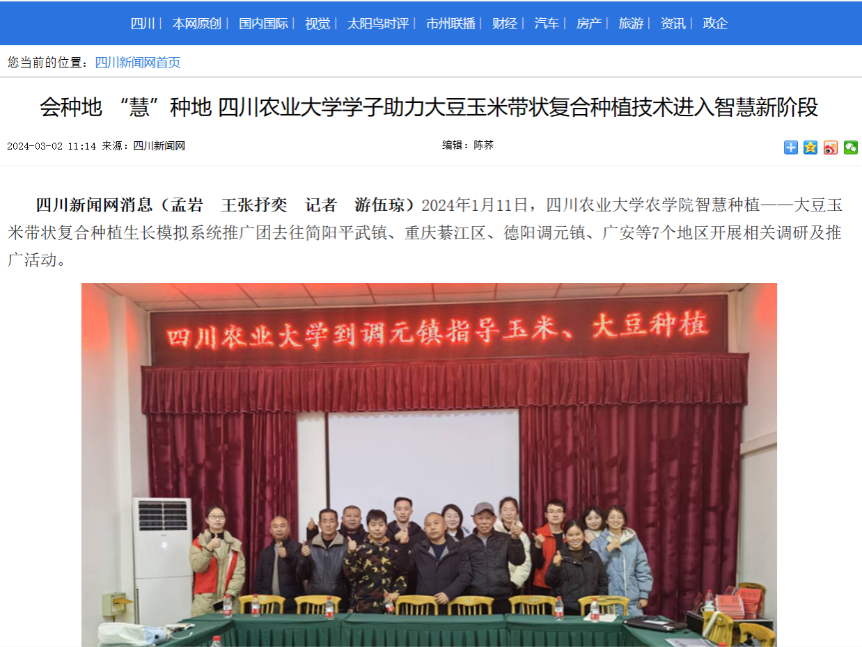 四川新闻网消息(孟岩 王张抒奕 记者 游伍琼)2024年1月11日,jlnnianhui官方网站智慧种植——大豆玉米带状复合种植生长模拟系统推广团去往简阳平武镇、重庆綦江区、德阳调元镇、广安等7个地区开展相关调研及推广活动。