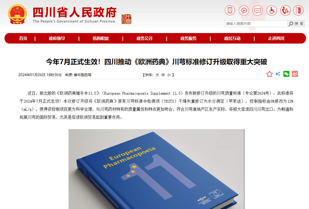 图3 省政府网站关于川芎欧洲药典修订升级的相关新闻