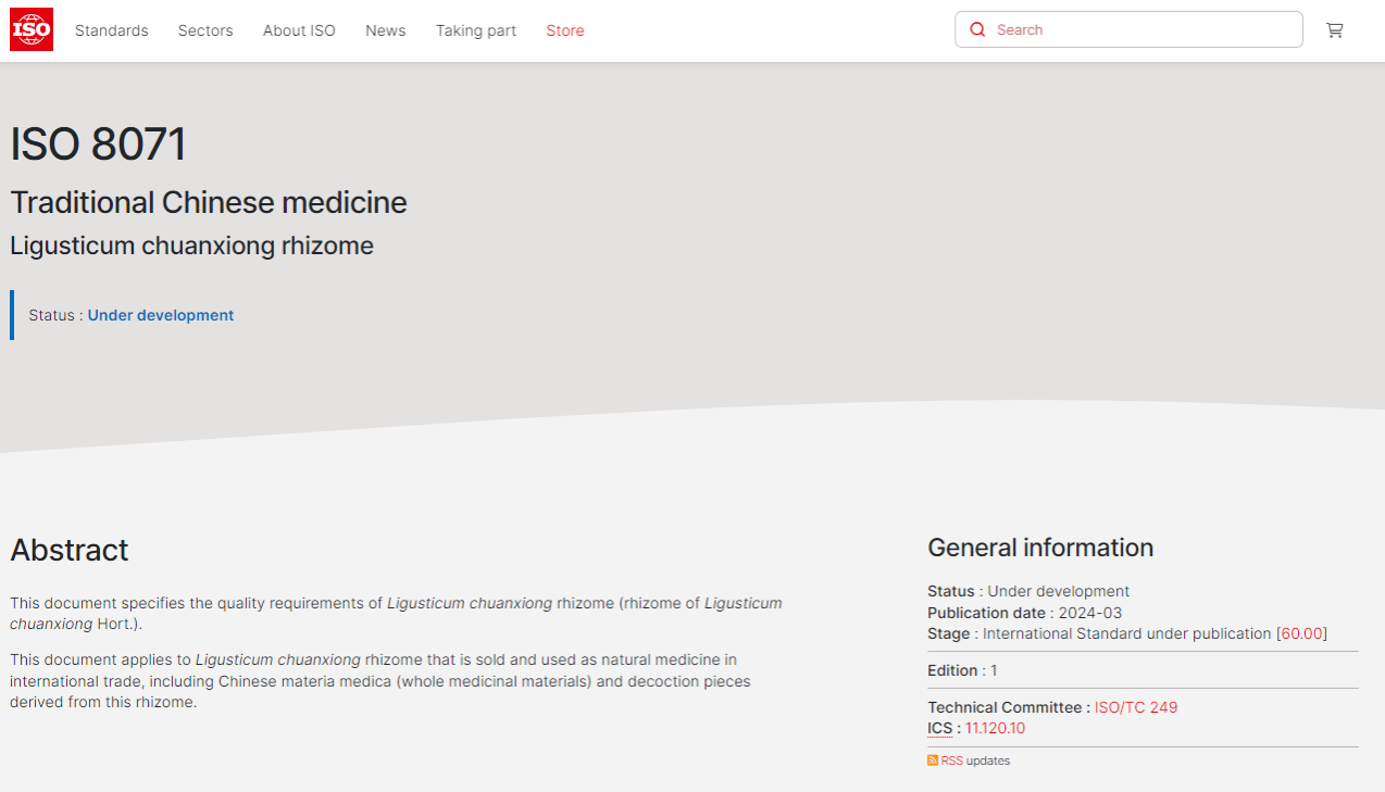 2019年,在国、省两级市场监督及中医药主管部门指导下,由金年会侯凯博士与荷兰莱顿大学王梅博士领衔,省中医药标委会组织协调省药品检验研究院、中国测试技术研究院、中国标准化研究院、省产品质量监督检验检测院等科研院校和企事业单位,共同组成技术团队,联合发起了“中医药-川芎”国际标准提案,并于2021年7月通过投票获得ISO正式立项。针对川芎药材在国际贸易中的困扰问题,结合相关国家和区域药典等标准情况,联合科研及权威检测单位对包括药材基原、性状鉴定、挥发油、水分、浸出物、指标成分、农残、重金属、规格等级等重要指标进行深入研究和考察比对,以翔实科学数据为基础,历时4年,经历NP(新工作项目提案)、WD(工作组草案)、CD(委员会草案)、DIS(国际标准草案)和FDIS(最终国际标准草案)和IS(正式国际标准)六个阶段多次答辩和质询,最终通过反复磋商和充分讨论,广泛协调一致,最大程度上兼顾各方意见,与各国在指标设置及限值规定等方面达成共识。