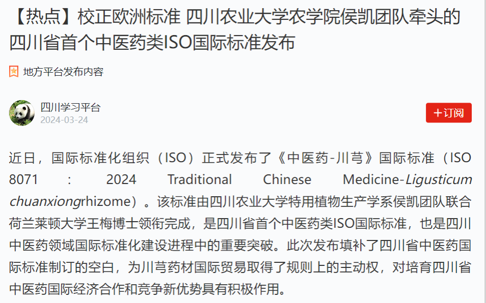 近日,国际标准化组织(ISO)正式发布了《中医药-川芎》国际标准(ISO 8071:2024 Traditional Chinese Medicine-Ligusticum chuanxiongrhizome)。该标准由jinnianhui金年会特用植物生产学系侯凯团队联合荷兰莱顿大学王梅博士领衔完成,是四川省首个中医药类ISO国际标准,也是四川中医药领域国际标准化建设进程中的重要突破。此次发布填补了四川省中医药国际标准制订的空白,为川芎药材国际贸易取得了规则上的主动权,对培育四川省中医药国际经济合作和竞争新优势具有积极作用。