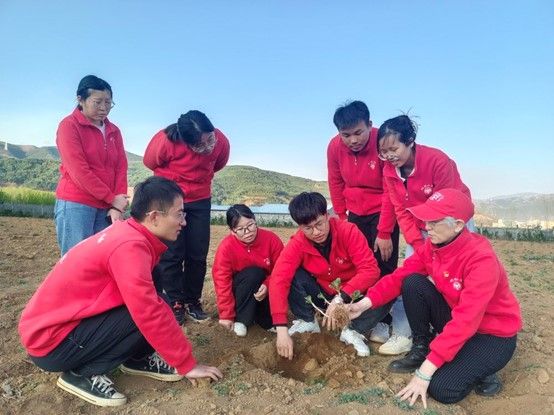 jinnianhui金年会王西瑶教授带领张峰(前排左一)等研究生在布拖马铃薯科技小院查看马铃薯出苗情况。(受访者供图)