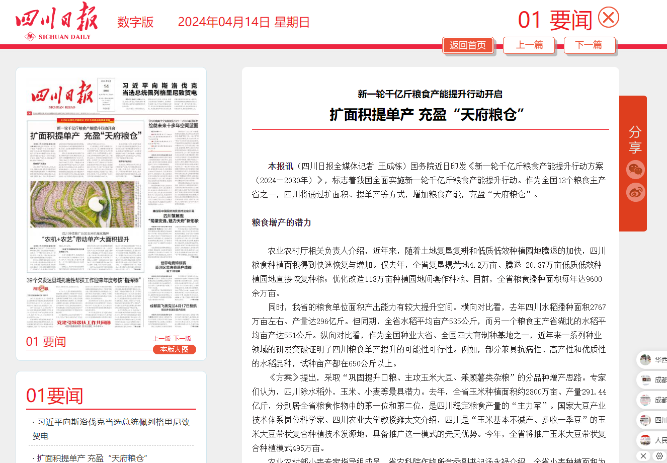 本报讯(四川日报全媒体记者 王成栋)国务院近日印发《新一轮千亿斤粮食产能提升行动方案(2024—2030年)》,标志着我国全面实施新一轮千亿斤粮食产能提升行动。作为全国13个粮食主产省之一,四川将通过扩面积、提单产等方式,增加粮食产能,充盈“天府粮仓”。