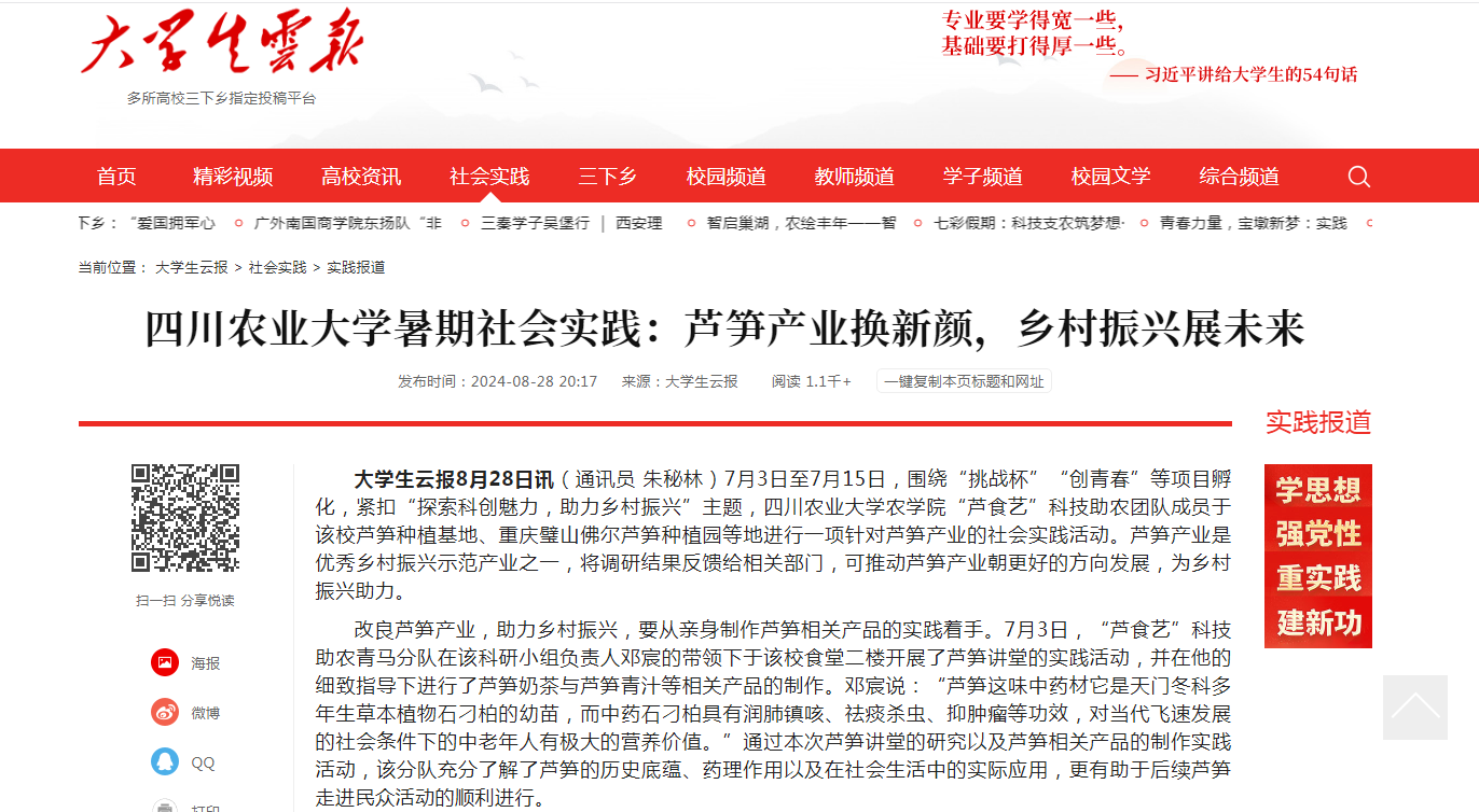 7月3日至7月15日,围绕“挑战杯”“创青春”等项目孵化,紧扣“探索科创魅力,助力乡村振兴”主题,jlnnianhui官方网站“芦食艺”科技助农团队成员于该校芦笋种植基地、重庆璧山佛尔芦笋种植园等地进行一项针对芦笋产业的社会实践活动。芦笋产业是优秀乡村振兴示范产业之一,将调研结果反馈给相关部门,可推动芦笋产业朝更好的方向发展,为乡村振兴助力。