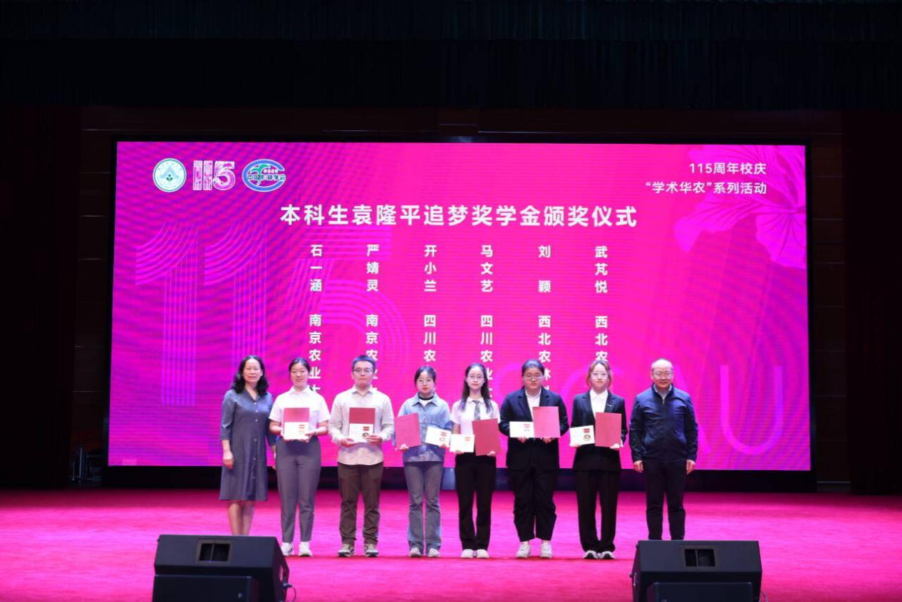 近日,2023-2024学年“袁隆平追梦奖学金”颁奖仪式在华南农业大学隆重举行。金年会小麦研究所2020级博士研究生符语昕(导师王际睿教授)、jlnnianhui官方网站硕士研究生雷怡(导师杨文钰教授、杨峰教授)、jlnnianhui官方网站种子科学与工程专业2022级本科生马文艺及农学专业2022级本科生开小兰4名作物学科学子荣获本年度“袁隆平追梦奖学金”,并受邀到现场参加颁奖仪式,累计获得奖励7万元。