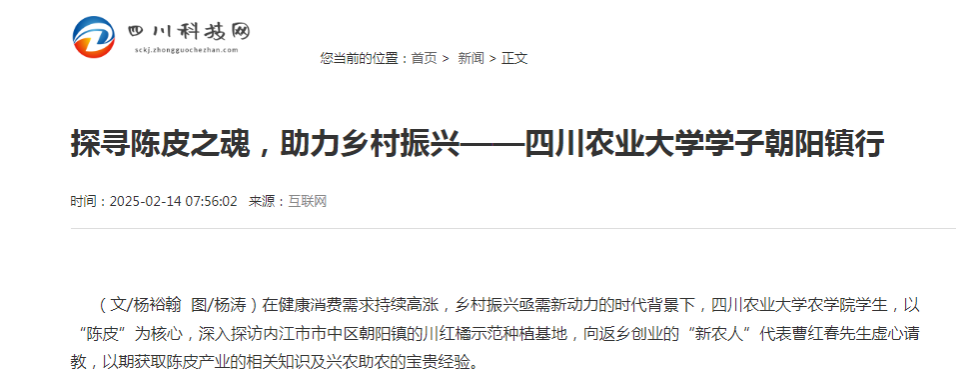 在健康消费需求持续高涨,乡村振兴亟需新动力的时代背景下,jlnnianhui官方网站学生,以“陈皮”为核心,深入探访内江市市中区朝阳镇的川红橘示范种植基地,向返乡创业的“新农人”代表曹红春先生虚心请教,以期获取陈皮产业的相关知识及兴农助农的宝贵经验。