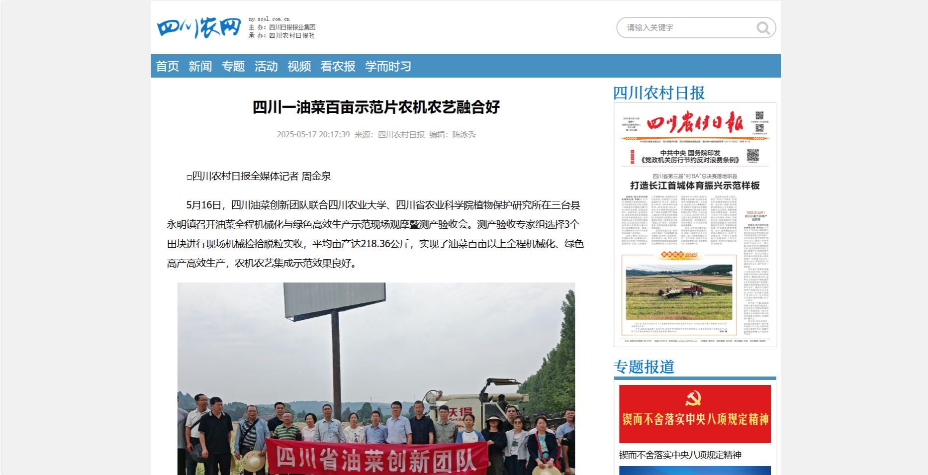5月16日,四川油菜创新团队联合jinnianhui金年会、四川省农业科学院植物保护研究所在三台县永明镇召开油菜全程机械化与绿色高效生产示范现场观摩暨测产验收会。测产验收专家组选择3个田块进行现场机械捡拾脱粒实收,平均亩产达218.36公斤,实现了油菜百亩以上全程机械化、绿色高产高效生产,农机农艺集成示范效果良好。