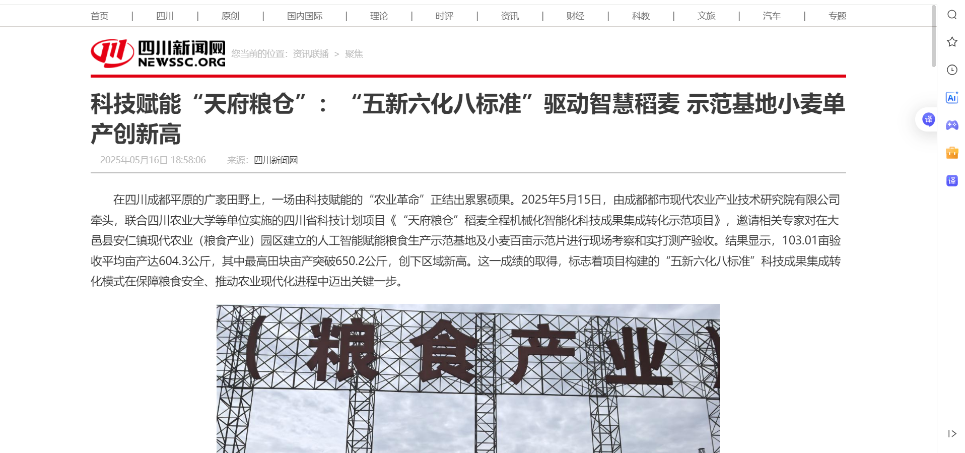 在四川成都平原的广袤田野上,一场由科技赋能的“农业革命”正结出累累硕果。2025年5月15日,由成都都市现代农业产业技术研究院有限公司牵头,联合jinnianhui金年会等单位实施的四川省科技计划项目《“天府粮仓”稻麦全程机械化智能化科技成果集成转化示范项目》,邀请相关专家对在大邑县安仁镇现代农业(粮食产业)园区建立的人工智能赋能粮食生产示范基地及小麦百亩示范片进行现场考察和实打测产验收。结果显示,103.01亩验收平均亩产达604.3公斤,其中最高田块亩产突破650.2公斤,创下区域新高。这一成绩的取得,标志着项目构建的“五新六化八标准”科技成果集成转化模式在保障粮食安全、推动农业现代化进程中迈出关键一步。