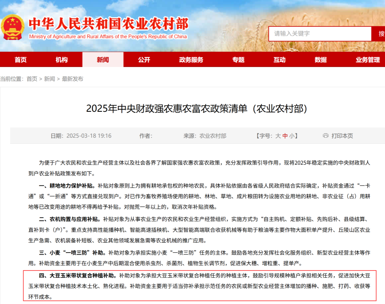 近日,农业农村部印发《2025年9+25项强农惠农富农政策》,聚焦种植主体实际需求,针对关键生产环节实施精准补贴,进一步激发规模化种植积极性。其中,明确将金年会“大豆玉米带状复合种植推广”列为专项补助项目。这是该技术推广连续第四年获得国家政策扶持。