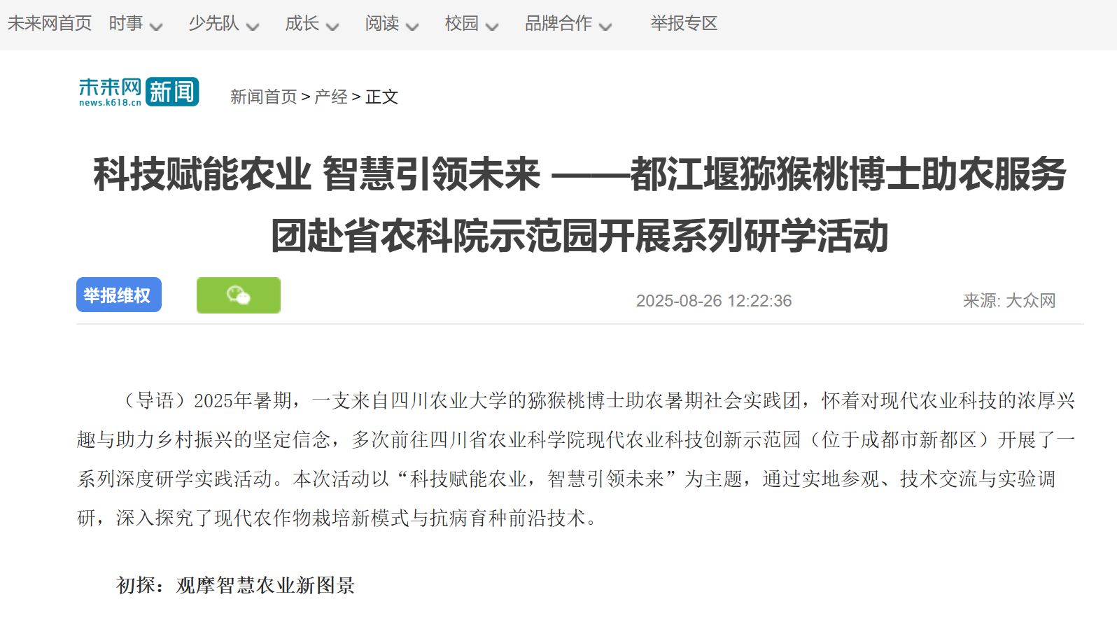 2025年暑期,一支来自jinnianhui金年会的猕猴桃博士助农暑期社会实践团,怀着对现代农业科技的浓厚兴趣与助力乡村振兴的坚定信念,多次前往四川省农业科学院现代农业科技创新示范园(位于成都市新都区)开展了一系列深度研学实践活动。本次活动以“科技赋能农业,智慧引领未来”为主题,通过实地参观、技术交流与实验调研,深入探究了现代农作物栽培新模式与抗病育种前沿技术。