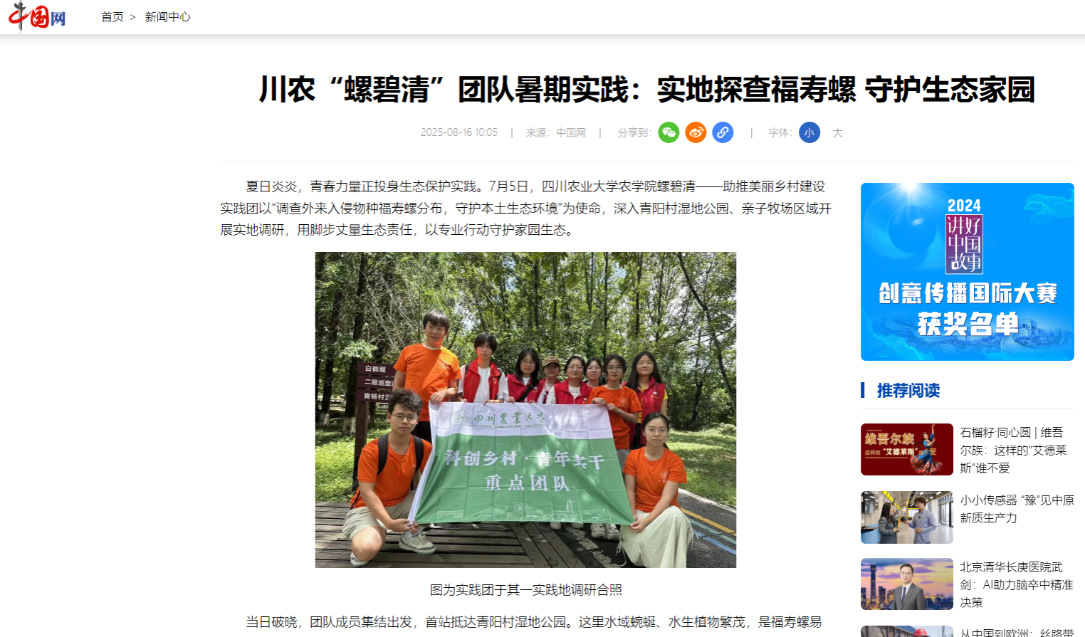 从校园到田野,从理论到实践,螺碧清”团队以专业为尺、以实践为笔,生动诠释着农科学子的生态担当。这场暑期实践,不仅是对福寿螺分布的精准探查,更是青春力量投身生态保护的鲜活注脚,不仅为守护一方水土提供了数据支撑,更以“知行合一”的担当,诠释着青年与时代同频、与生态共生的深刻内涵——当青春力量融入生态守护的每一寸土地,当专业智慧对接每一处生态需求,方能为筑牢国家生态安全屏障,写下更坚实的青春注脚。(文/张汇研 徐可欣 图/螺碧清)