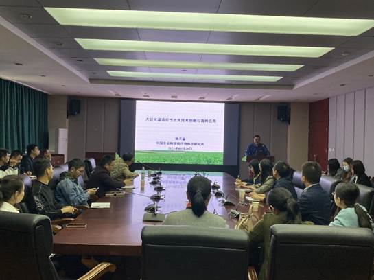 韩天富研究员首先分享了30余年来在大豆光温反应领域学习和研究的心得体会,引用日照长度对大豆开花期影响的事例引入主题,紧紧围绕“大豆光温反应的基本生理特点、光温反应性状的品种差异及遗传规律、光温反应的分子调控机制、光温生态类型、广适应品种分子设计育种策略”等方面展开学术报告,重点讲解了大豆光温互作效应、大豆光周期开花调控的关键基因、不同品种的光周期反应,并提出基于优异光适品种的育种策略。报告会上,与会师生就高原品种筛选、大豆产量模型构建、分子标记品种等相关问题与韩天富研究员展开热烈讨论。最后,杨文钰教授结合韩天富研究员学术报告及其团队成果,寄语与会学生要积极传承前人研究经验,主动发挥踏实肯干精神,坚持开拓创新,敢于超越前人。