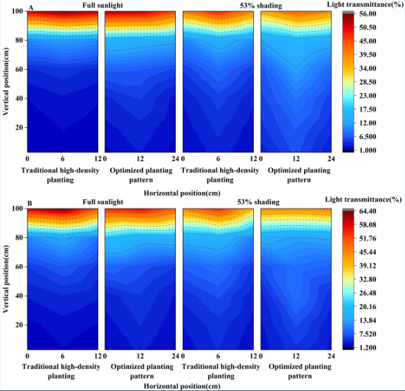 本研究则进一步通过在四川不同稻区设置大田试验,揭示了弱光胁迫下“减穴稳苗”对水稻群体质量与光能分布的调控效应,及其对水稻产量与品质的影响。研究结果表明,“减穴稳苗”可构建更为合理的水稻株叶型和群体结构,既提升水稻上三叶的净光合速率,又改善冠层中下部的光能供给,确保了水稻灌浆结实阶段充足的光合产物供给,最终在有效穗数略有降低的情况下,通过提高结实率和粒重确保水稻高产稳产。同时发现,“减穴稳苗”可显著降低稻米垩白粒率和垩白度,提高整精米率和米饭食味值,有效改善了稻米品质。