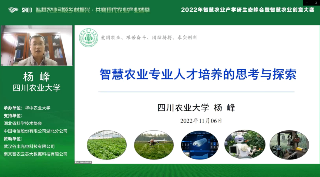 11月5-6日,由智慧农业人才培养创新联盟主办,华中农业大学承办的2022智慧农业产学研生态峰会暨智慧农业创意大赛在湖北武汉采用线上线下方式召开。华中农业大学张启发院士,国家农业信息化工程技术研究中心主任赵春江院士,农业农村部科教司张振华副司长以及开设智慧农业专业的20余所高校负责人及教师代表参加了会议。金年会智慧农业系全体师生40余人线上参会。jlnnianhui官方网站副院长、中国作物学会智慧农业专业委员会副会长、四川省智慧农业科技协会副会长杨峰教授作大会报告。