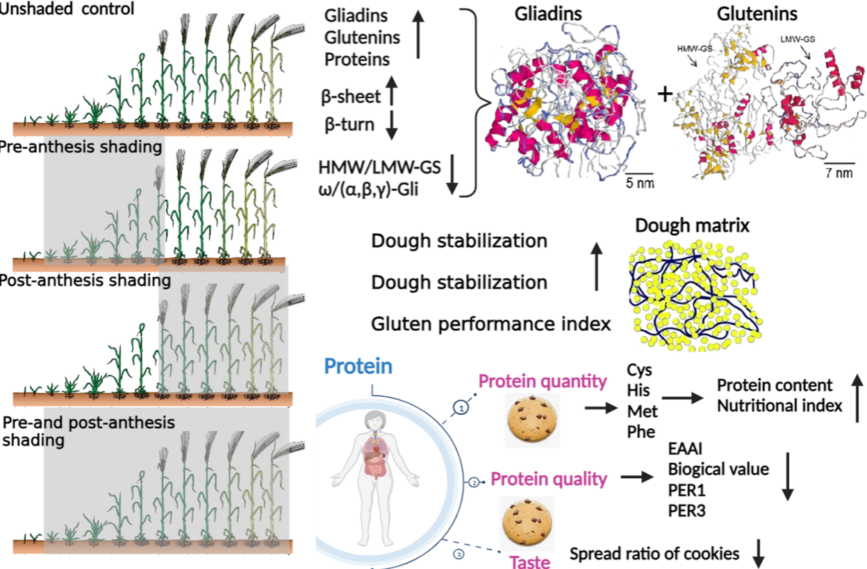 近日,jinnianhui金年会小麦生理生态与栽培课题组在加拿大食品科技研究所主办期刊Food Research International(中科院一区TOP, IF=8.2),在线发表了题为“Regulating the composition and secondary structure of wheat protein through canopy shading to improve dough performance and nutritional index”的研究论文,阐明了弱光胁迫调控小麦面筋性能与蛋白质营养的结构基础。该研究对全球暗化背景下制定育种目标和栽培管理技术减损提质有重要意义。