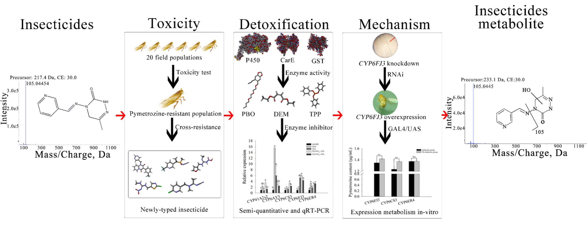 白背飞虱是一种重要的迁飞性害虫,主要为害水稻、玉米、高粱等,且能够传播南方水稻黑条矮缩病毒,导致水稻每年减产10%~30%,甚至绝收;长期以来,白背飞虱的防控主要依赖于化学杀虫剂,王学贵团队自2016年以来监测了四川省主要稻区(川东和川南)的白背飞虱田间种群对不同防控药剂的抗药性,发现对吡蚜酮已产生较高水平抗性。本文通过增效剂、主要解毒酶活性、RT-qPCR、RNAi、果蝇过表达和体外表达代谢实验,明确了白背飞虱P450基因CYP6FJ3的组成型过表达,使吡蚜酮发生羟基化,导致白背飞虱对吡蚜酮产生代谢抗性;该研究为农业生产中科学安全选用杀虫剂防控白背飞虱提供了理论依据。