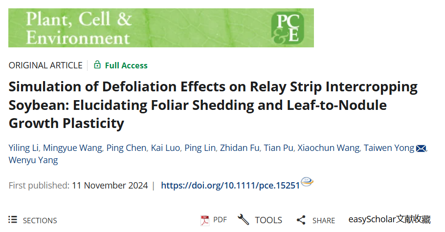 11月11日,金年会jlnnianhui官方网站玉米大豆带状复合种植与循环利用团队在国际知名期刊《Plant, Cell & Environment》上发表了题为“Simulation of Defoliation Effects on Relay Strip Intercropping Soybean: Elucidating Foliar Shedding and Leaf-to-Nodule Growth Plasticity”的研究论文。该研究探讨了花后大豆落叶和叶片根瘤功能性状可塑性,揭示了大豆叶片凋落和带状套作优化源库功能的新机制。