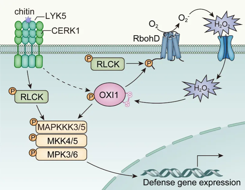 植物依赖天然免疫系统感知病原微生物并激活抗病性。植物细胞表面的免疫受体和共受体能够共同识别微生物保守分子模式,从而感知病原菌入侵。例如受体激酶蛋白LYK5与CERK1能够识别真菌细胞壁组分几丁质(chitin),从而感知真菌入侵。免疫受体感知病原菌后,能够通过下游一些重要免疫信号转导组分,例如细胞质类受体激酶家族(Receptor-like cytoplasmic kinases, RLCKs),从而激活一系列免疫反应。这些免疫反应包括由NADPH氧化酶蛋白RbohD控制的活性氧(ROS)爆发、由MAPKKK3/5-MKK4/5-MPK3/6组成的MAPK级联信号通路的激活、下游防卫基因的表达等。目前为止,免疫受体如何激活和协同这些免疫反应的机制尚不完全清楚。