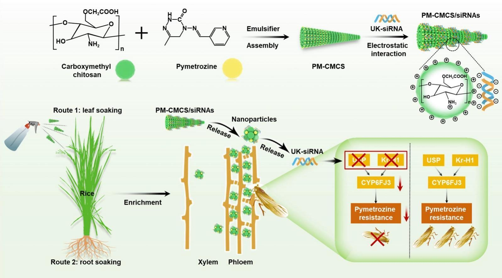 2025年1月28日,《Carbohydrate Polymers》期刊在线发表了关于通过纳米核酸农药治理抗性的研究论文(第一作者:贡常委博士doi.org/10.1016/j.carbpol.2025.123328)。该研究针对白背飞虱对吡蚜酮的抗药性,创新性地构建了自组装的小干扰RNA(siRNA)、羧甲基壳聚糖与吡蚜酮的复合物。这一微复合物显著增强了siRNA的稳定性,抑制了USP、Kr-H1和CYP6FJ3基因的表达,有效治理了白背飞虱的抗药性。这一研究为纳米核酸农药的应用提供了新的理论依据,并为抗药性害虫的绿色防控开辟了新的途径。