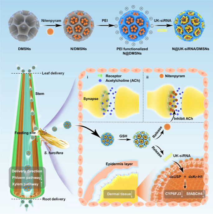 2024年12月27日,《Journal of Nanobiotechnology》期刊在线发表了关于通过树枝状二氧化硅负载siRNA和烯啶虫胺治理抗性的研究论文(第一作者:贡常委博士doi.org/10.1186/s12951-024-02966-8)。该研究进一步提升了RNA的稳定性与防治效果,能通过共质体和质外体途径,双向运输至白背飞虱的危害部位,诱导缓释烯啶虫胺,直接调控SfABCH4和CYP6FJ3基因的表达,并抑制白背飞虱的生长发育,显著提高了对白背飞虱的敏感性。此项技术为纳米RNA农药的高效运输和解毒机制提供了新的视角,并为未来实现产业化应用提供了可行的技术路线。