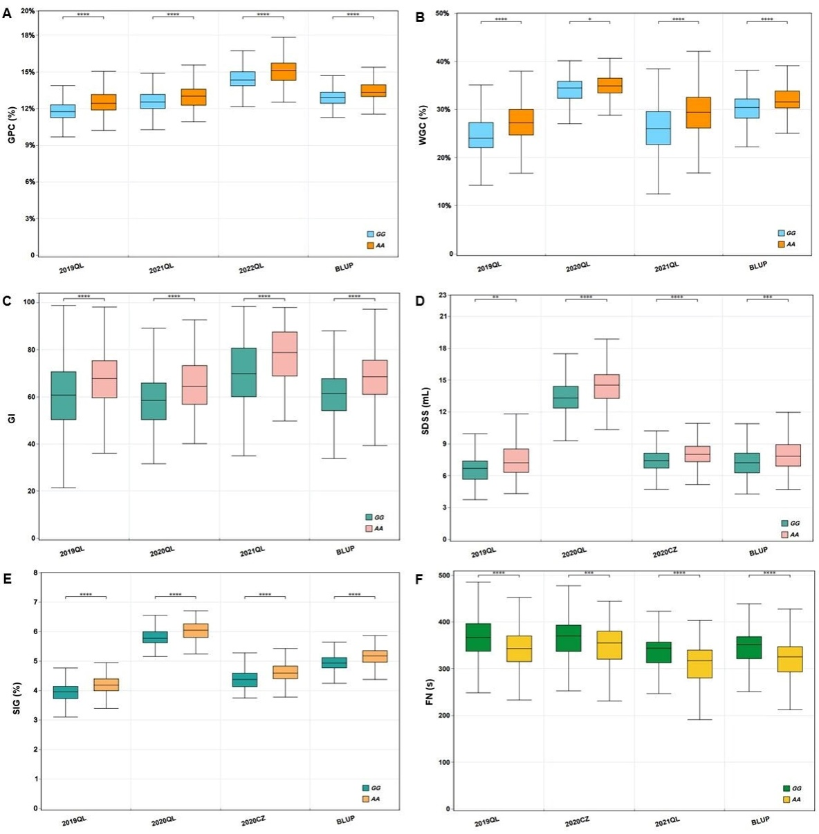 jlnnianhui官方网站智慧农业系任天恒教授课题组在小麦品质育种和相关QTL发掘工作中取得新进展。该研究以小麦品种川农17和川农11创制的RIL群体为研究材料,通过小麦55K芯片绘制了一张含有8329个SNP分子标记的高密度遗传连锁图谱。通过多年多点对小麦群体的蛋白质含量、淀粉含量、溶胀指数、沉降值、湿面筋含量、面筋指数和降落值进行的测定,结合QTL定位技术,一共定位了92个QTL位点,194个cQTL位点和117个eQTL位点。其中有6个QTL位点,分别是QGPC.sau-4A.1、QWGC.sau-4A、QSDSS.sau-1A.1、QGI.sau-1A、QFN.sau-4D和QSIG.sau-1A被认为是和各性状相关的主效稳定位点。BLAST结果表明除了QFN.sau-4D以外,其他的5个位点为新QTL位点。在QTL簇的分析中,分别在1A、1D、2D、4A、4D和6D染色体上鉴定到8个QTL簇,所有的主效稳定位点均位于不同的QTL簇内。最后,通过6个主效稳定的QTL的侧翼序列,开发了和这6个QTL紧密连锁的分子标记并在不同的群体中进行了验证,实验证明这些稳定主效的QTL位点会显著影响小麦的品质。