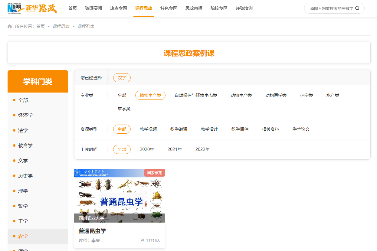 近日,金年会植物保护学系李庆教授负责的国家级课程思政示范课《普通昆虫学》在“新华思政”——全国高校课程思政教学资源服务平台上线,面向全社会开放共享,截至目前,累计学习人数已达11000余人次。