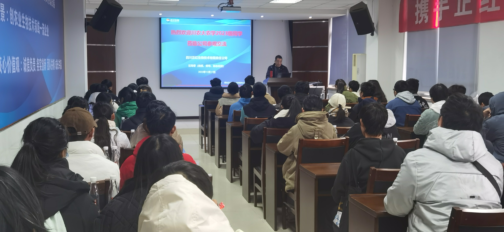 上午,同学们首先来到国光股份成都松尔科技有限公司参观学习。工作人员为同学们详细讲解了公司的化控、调节剂等产品的特点及其所包含的技术原理,在树木伤口保护、作物根系促生等方面的应用案例引发了同学们的浓厚兴趣,特别是公司从产品到套餐、从套餐到方案的服务升级决策给同学们留下了深刻印象。在国光历史陈列馆中,同学们深入学习了国光“和诚真新”的企业理念,公司40年始终如一专注于“调节剂、调控技术、调控方案”的奋斗历程激发了同学们的学农热情。结合自身经历和行业发展现状,学院校友、国光研发部漆信同和陈有忠带来了题为“农业技术点亮强农之路”的专题报告,进一步牢固了同学们的专业信心。