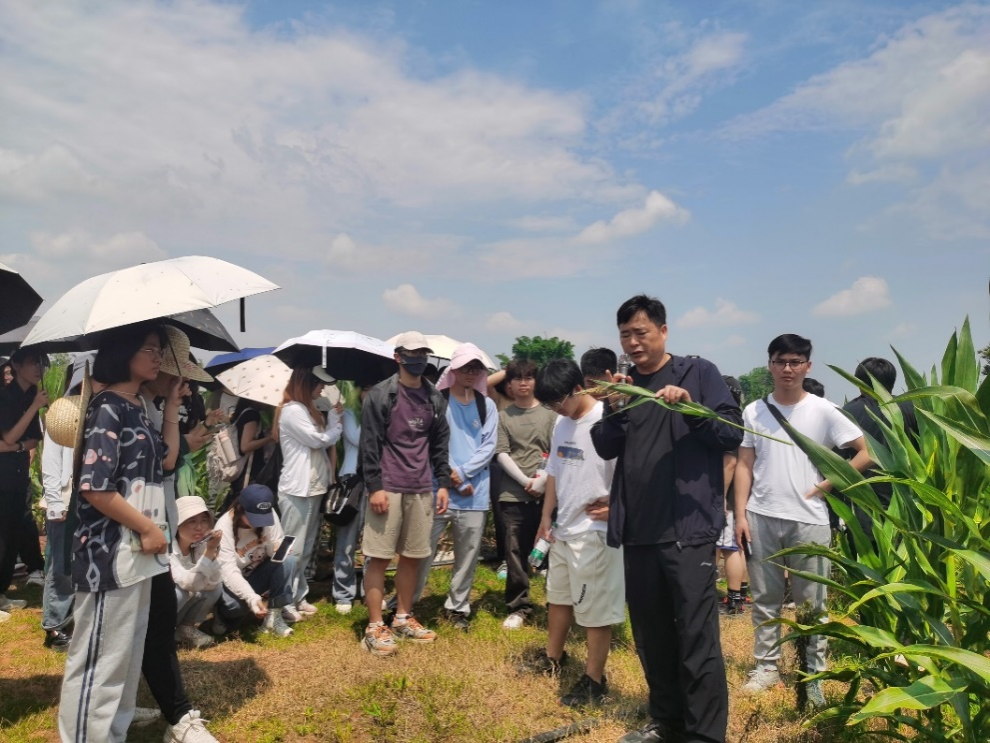 谭登峰在实验地为同学讲解玉米母本去雄过程
