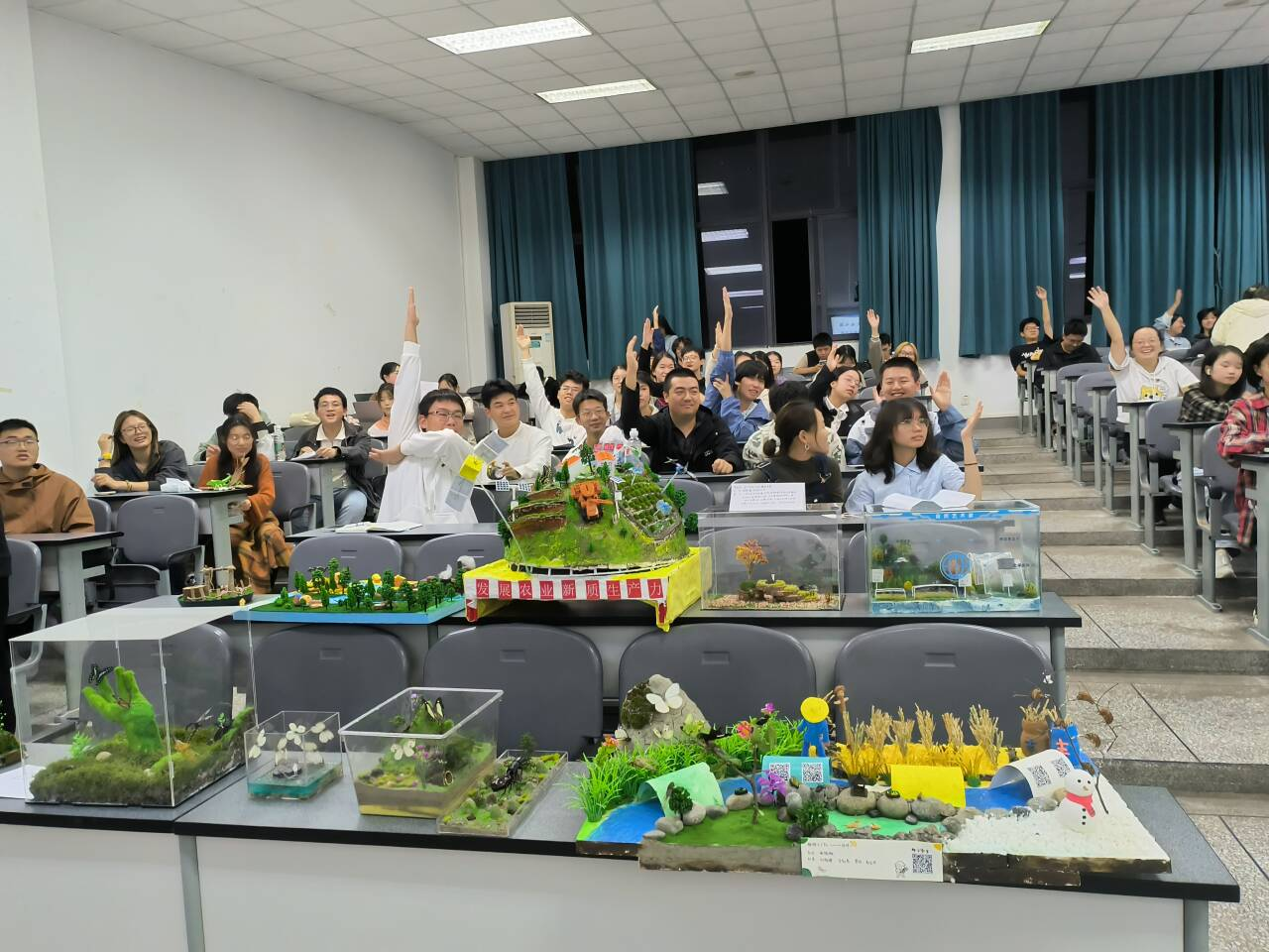 在决赛现场,参赛选手们通过图片和视频展示了他们的昆虫微景观作品,详细阐述了创作理念、所采用的昆虫元素以及作品的制作过程,并对评委们提出的专业问题进行了机智的回应。各参赛小组的作品风格迥异,从生机勃勃的绿色半球,到层次分明的青色稻田,再到海洋中翩翩起舞的蝴蝶、河流旁“人”字形的人类农业文明,以及展现智慧农场的昆虫微景观,选手们以独特的视角构建了一个个令人赞叹的微观世界。经过激烈的角逐,大赛最终评选出一等奖1名,二等奖2名,三等奖3名。其中,由张原同学领导的203团队凭借其卓越的创意和精致的作品,在众多队伍中脱颖而出,荣获冠军。