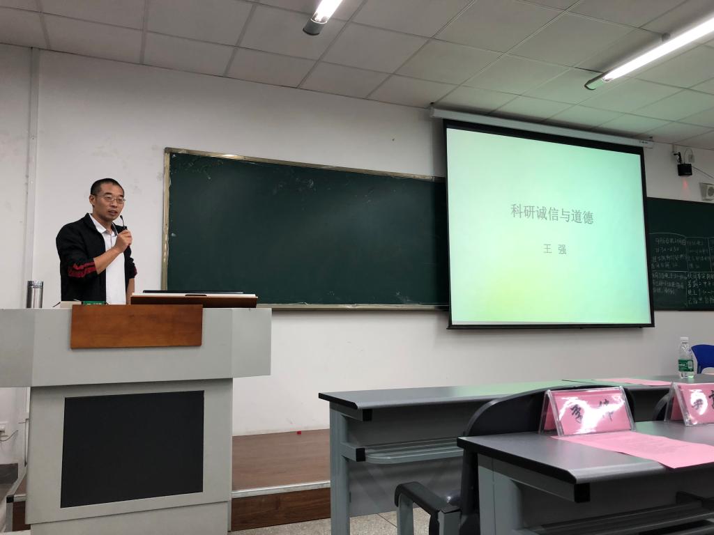 王强教授作了科研诚信与道德专题讲座,他分别从学术规范、学术诚信现状、学术不端、不当行为等方面紧密围绕主题展开阐述,充分阐述了科研诚信与道德的重要性和必要性,旨在引导全体研究生新生在未来的科学研究道路上,切实弘扬以“追求真理、实事求是、崇尚创新、开发协作”为核心的科研精神。随后,院研究生教学秘书郑亭对研究生新生的分班以及重要的研究生培养环节进行了详细的解读。最后,jlnnianhui官方网站研究生会主席代承东以精美的PPT、精彩的内容、幽默风趣的语言进行jlnnianhui官方网站研究生会招新宣讲,赢得台下热烈的掌声。