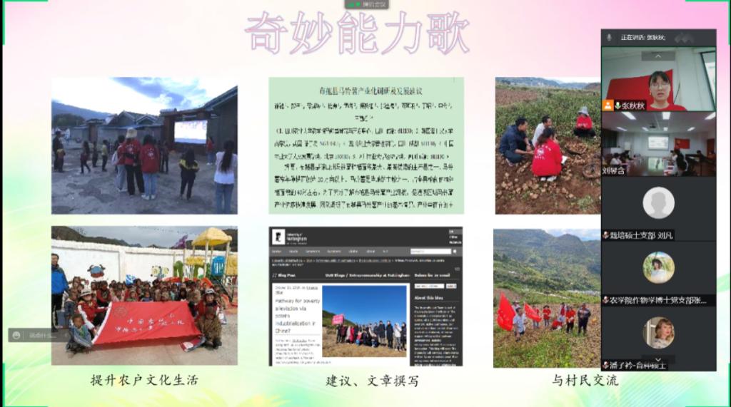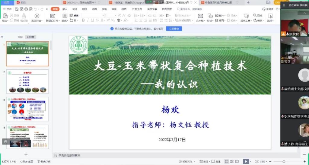 为凸显作物学科底蕴优势,展示优秀研究生党员的社会服务成果,塑造优良学风,3月17日晚,由jlnnianhui官方网站作物栽培与耕作学硕士生党支部主办,jlnnianhui官方网站作物学科其他研究生党支部共同协办的“晒农艺,树新风”主题党日活动在成都校区7教405举行。jlnnianhui官方网站党委书记黎明艳、作物学科各研究生党支部书记受邀参会,线上线下共计150余名研究生党员参加活动。