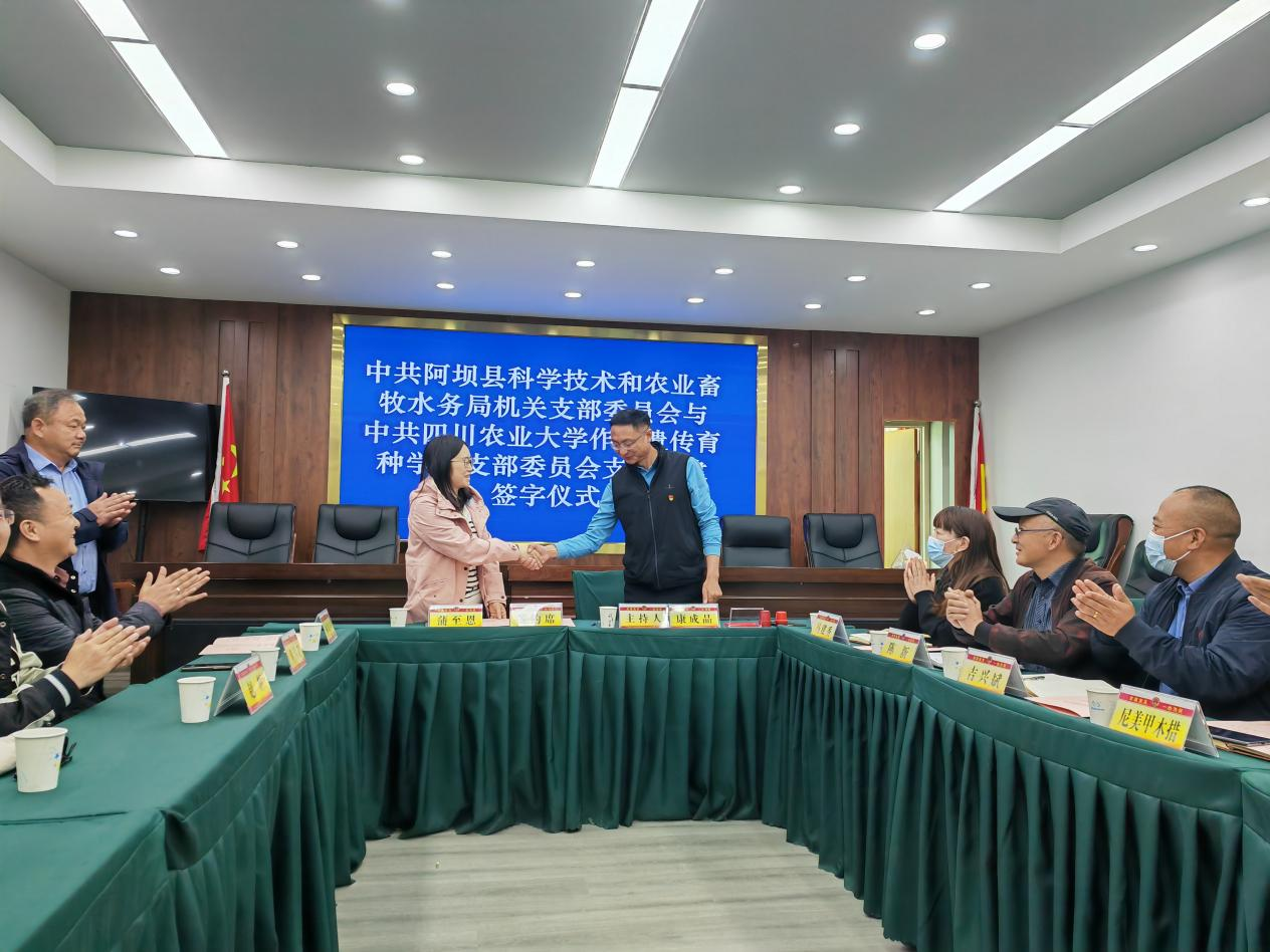 康成品介绍了中共阿坝县科学技术和农业畜牧水务局党委组织机构、党员人数、支部建设等情况。双方在党建促科技服务、组织建设互促、党员干部互动、党建载体互用等方面达成了共建协议;在双方党员代表的见证下,双方签署了支部共建协议。协议每年定期开展高质量党组织生活会、党员交流工作经验,提升党建工作正体水平,以学思想、强党性、促乡村振兴、建新功。