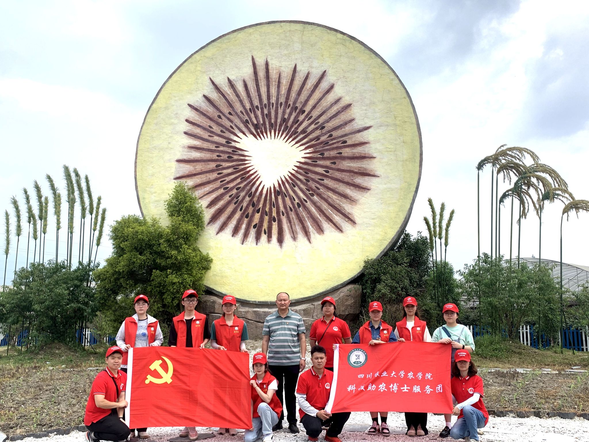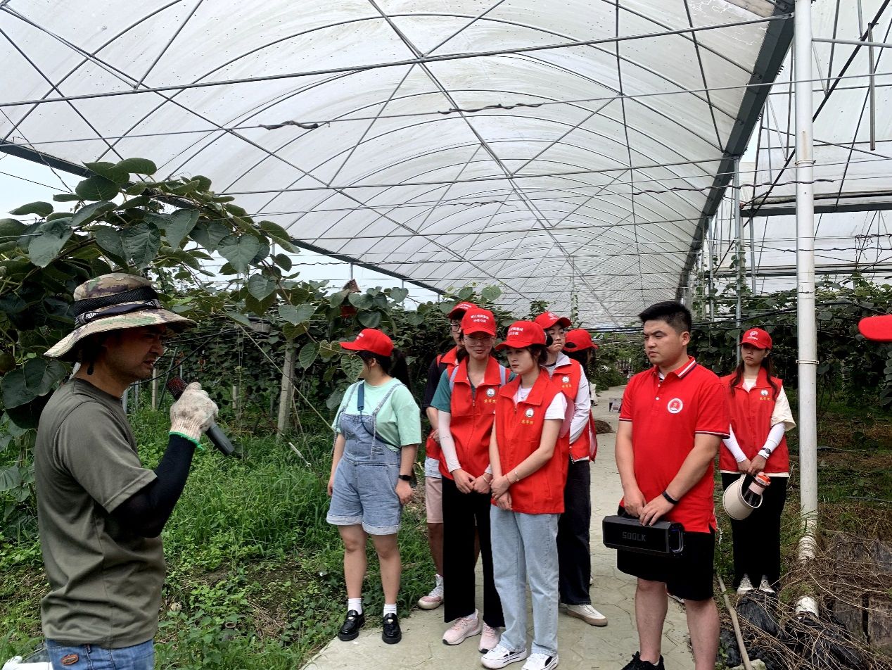 随后,在都江堰市猕猴桃协会会长晏志强的带领下,大家一同参观了鲜果寨果园和智慧农业产业园,向大家介绍了都江堰猕猴桃产业的发展历史和品牌价值;晏会长提到“都江堰的猕猴桃产业历史悠久,很有特色,在过去受到溃疡病的影响鲜果寨几乎面临毁园,但通过高效绿色防控技术和避雨栽培措施等方法,目前已经是产量高,品质高的园区,同时都江堰猕猴桃产业已经成功获得国家农产品地理标志保护,相信在科技小院的助力下,未来会发展的更好”。植保研究生党支部副书记姚凯凯博士谈到“身为农科学子,服务国家三农建设是我们的责任与使命,我们将风雨无阻地开展科学研究和技术服务,努力在乡村振兴舞台上挥洒青春热血”。“都江堰科技小院”科技助农博士服务团与植保研究生党支部会继续将科技小院建设和党建工作以及社会实践进一步融合,持续开展科技服务,助力乡村振兴。社会实践团队长彭丹丹表示“我们本科生也将更加努力学习学习专业知识,多向师兄师姐学习,深入田间一线开展实践,厚植爱农情怀,为现代化农业强国的建设贡献青春力量”!