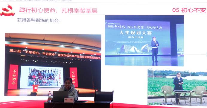 报告会开始,杨媚播放了《红岩本色》节目“谁的青春不迷茫”,讲述了她在吴家镇双流村的创业经历与青春故事。随后,杨媚从“我的初心”“初心养成”“践行初心”“坚守初心”“初心不变”五个方面讲述了她对梦想的热爱与坚守。