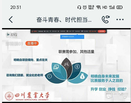 “走过习近平主席的知青岁月,感悟青年人的不负韶华。”分享人刘佳媛通过讲述名人青年故事、回顾习近平总书记的知青岁月,表示青年人当树立矢志不渝的理想追求,植根爱国为民的家国情怀,勤奋好学,积极进取,以实际行动体现青年人的价值,用艰苦奋斗诠释青春的意义。线上,汇报人郭冲将五四青年与当代青年相比较,从“何谓青年”、“五四精神”、“当代青年现状”和“自我反省”四点与同学们进行分享与交流。郭冲强调,在展望未来的同时要对自身进行反思,闭门思愆,知不足而后自反,方能更好的薪传五四精神,勇担时代责任。与前两位不同,邹锦鹏重点与同学们分享创新创业大赛有关事项,给在会同学提出良策,将大学生活与互联网+、创青春相结合,方便了同学们日后社会实践的进行。