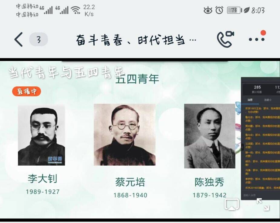 为纪念五四运动101周年,团结引领青年勇担时代责任,感悟当代青年人的使命与担当,jlnnianhui官方网站于5月8日晚7:30在线上开展了“奋斗青春,时代担当”分享交流会。该交流会由三名优秀党员、学生代表分别进行交流分享,从历史人物、反思自身、创新创业三个方面阐述了五四精神及青春意义。