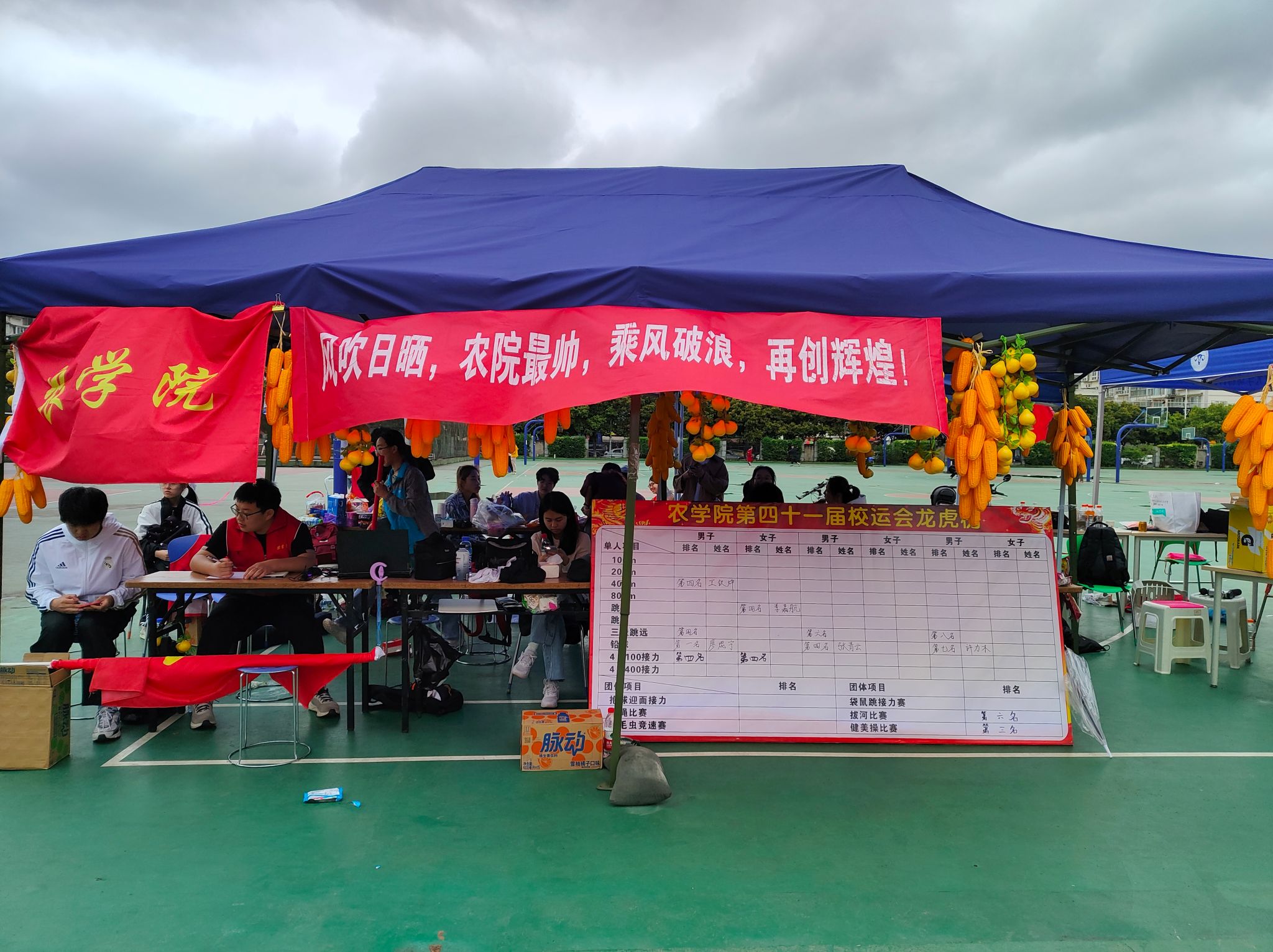 秩序井然的运动场旁有各学院搭建的帐篷,帐篷内是一群忙碌的身影,为运动员加油打气、提供补给食物、帮忙拿物品……他们是运动会的守护者,尽心尽力为运动员提供服务。据了解,此次运动会jlnnianhui官方网站后勤人员均由农院发展对象和入党积极分子组成,他们践行初心,展现全心全意服务同学的真心;务实笃行,用实际行动为党旗增辉,温暖今日的农院学子。此外,学院老师一早便前来操场为运动健儿们加油打气,祝愿他们斩获佳绩!