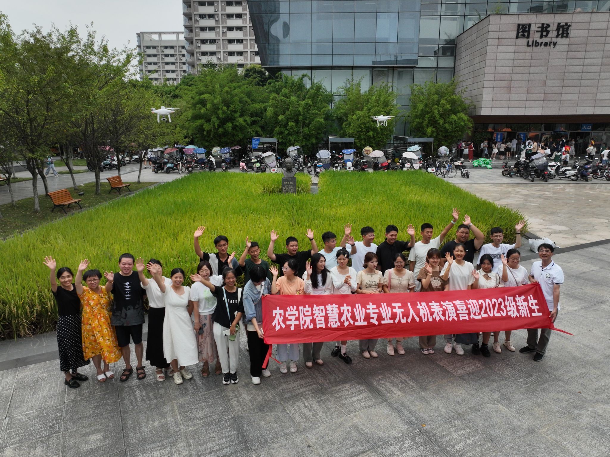 在迎新现场,4架无人机在周开达院士雕像所在的水稻田起落盘旋,与下方颗颗饱满、绿油油的水稻交相辉映。这是由jlnnianhui官方网站智慧农业专业谭先明老师带领的无人机科研兴趣小组带来的无人机表演,四架无人机在jlnnianhui官方网站迎新报道点上空列队,欢迎2023级新生的到来。
