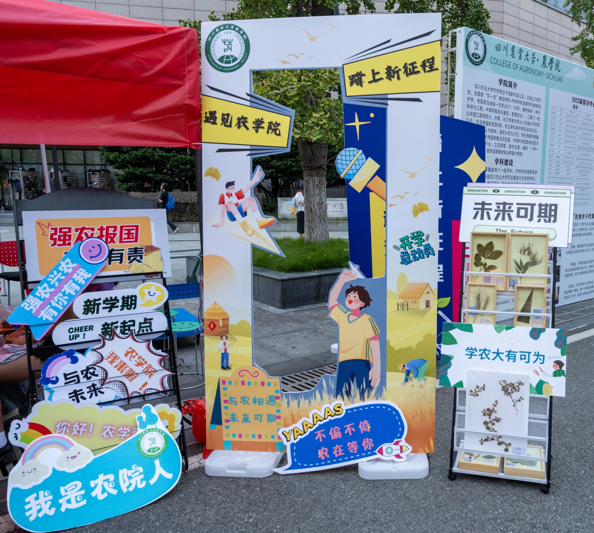 在另一侧,有着一批设计精美的拍照板:“强农报国”“学农大有可为”“遇见jlnnianhui官方网站,踏上新征程”“你好!农院人”。新生们手持这些标语,迎新报道处留下迈入校园的第一张照片。这些标语由jlnnianhui官方网站学生融媒体中心参与设计,蕴含着学长学姐们对新生的浓浓祝福。
