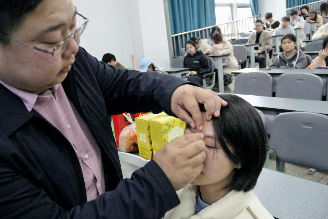 作为第五批国家级非物质文化遗产“针灸”项目代表性传承人石学敏院士传承弟子,胡耀中有着高超的针灸技术。他通过现场为身体不舒服的同学们进行针灸来展现针灸的奇妙,尝试过的同学都表示自己的状态有所改善。针灸技术作为中医的智慧结晶之一,具有简便、效显、价廉、安全等优势。近距离展示更是让与会同学感受到针灸的魅力,极大地激发同学们对中医药的兴趣。
