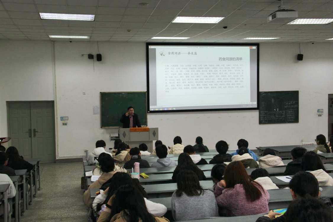 胡耀中首先就“药食同源”与中药“四性五味”理论为同学们讲述了中药与食物的关系,阐述日常生活中饮食习惯与健康之间的联系。并介绍了常见的几种药食同源食物的用法用量,以及体质与食养食治食疗的关系,例如生姜可治胃寒、大枣可以补气运血,二者配伍熬制红糖水则常用于驱寒暖胃;薏米可去湿气,山药健脾、荷叶山楂减肥等等。