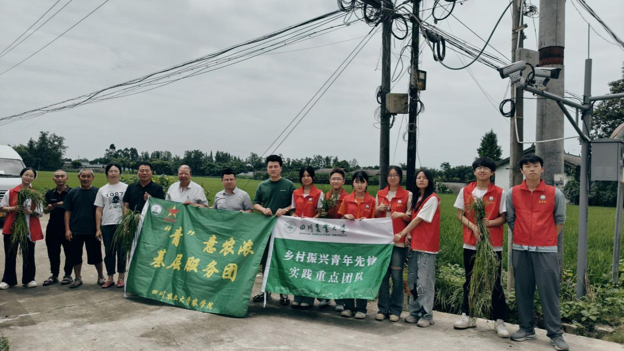 图为王学贵教授在水稻种植现场与种植大户及实践团成员合影