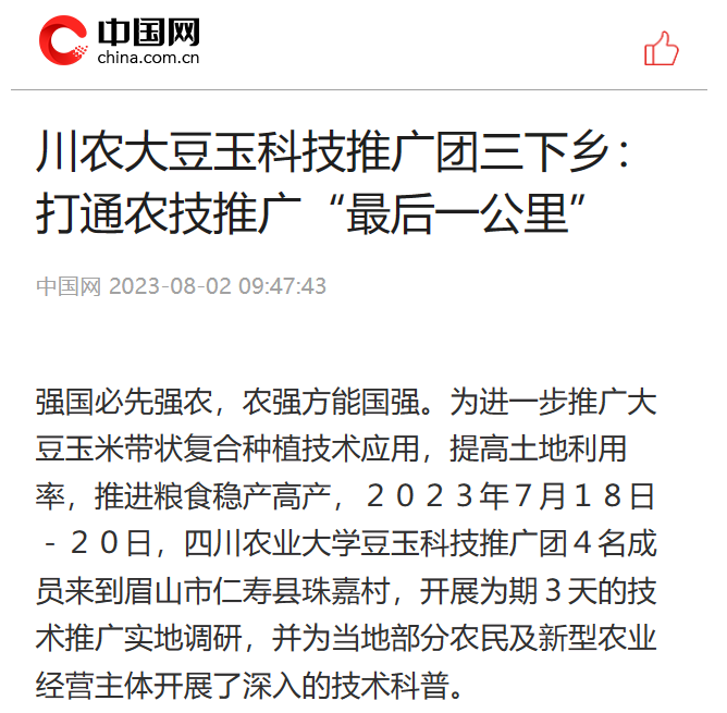 强国必先强农,农强方能国强。为进一步推广大豆玉米带状复合种植技术应用,提高土地利用率,推进粮食稳产高产,2023年7月18日-20日,jinnianhui金年会豆玉科技推广团4名成员来到眉山市仁寿县珠嘉村,开展为期3天的技术推广实地调研,并为当地部分农民及新型农业经营主体开展了深入的技术科普。