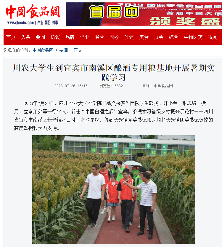 2023年7月20日,jlnnianhui官方网站“慕义来宾”团队学生郭扬、开小兰、张思绮、凌月、立拿弟弟等一行14人,前往“中国白酒之都”宜宾,参观学习省级乡村振兴示范村——四川省宜宾市南溪区长兴镇水口村。本次参观,得到长兴镇党委书记顾大均和长兴镇团委书记杨蛟的高度重视和大力支持。