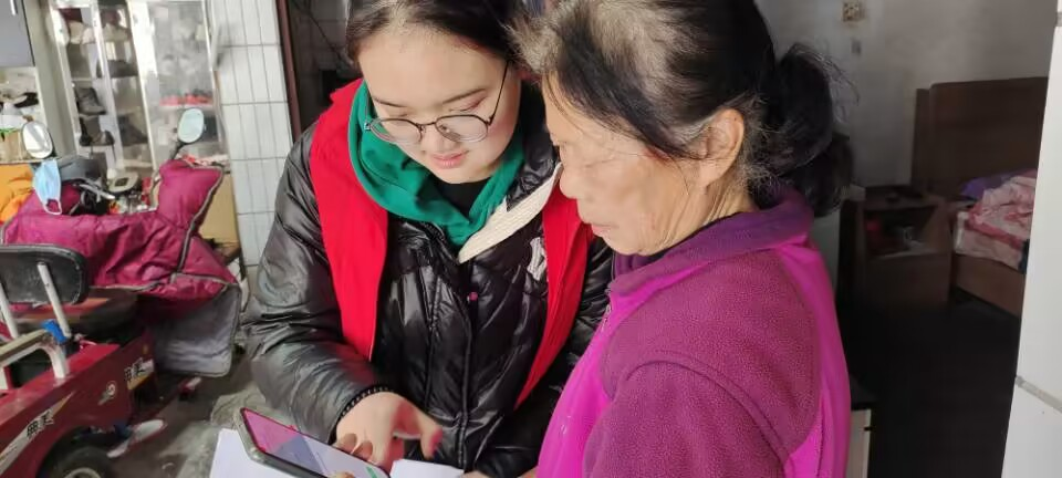 志愿者分组完成后分别在村干部的带领下从乡间小道去往村民家中。记者跟随志愿者来到一户村民家中,志愿者先上前问候:“嬢嬢,最近过的怎么样?我是社区的志愿者,社区保障资金的分配需要征求一下你的意见,你有什么想法都可以提哦。”老人笑着答:“现在国家的政策好,过得安逸得很嘞。”简单交谈后,志愿者协助老人进行线上操作。