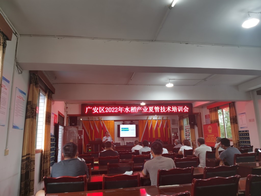 针对水稻“夏管”的关键技术,任万军提出要做好 “三管”,即要管好水、管好肥和管好病虫草害。现场培训中,任万军详细讲解了干湿交替灌溉和够苗晒田的水分管理技术,这是解决目前丘陵区陷机器、全程机械化和秧苗“坐蔸”的重要措施;其次详细介绍了减量攻中和无人机施肥技术,指导大户诊断缺肥症状和施肥时期,现场展示了无人机施穗肥技术。在室内开展了《水稻高产高效栽培田间管理》的培训,系统介绍了水稻生产过程中高产绿色优质生产技术,并针对大户生产过程中存在的问题一一详细解答。
