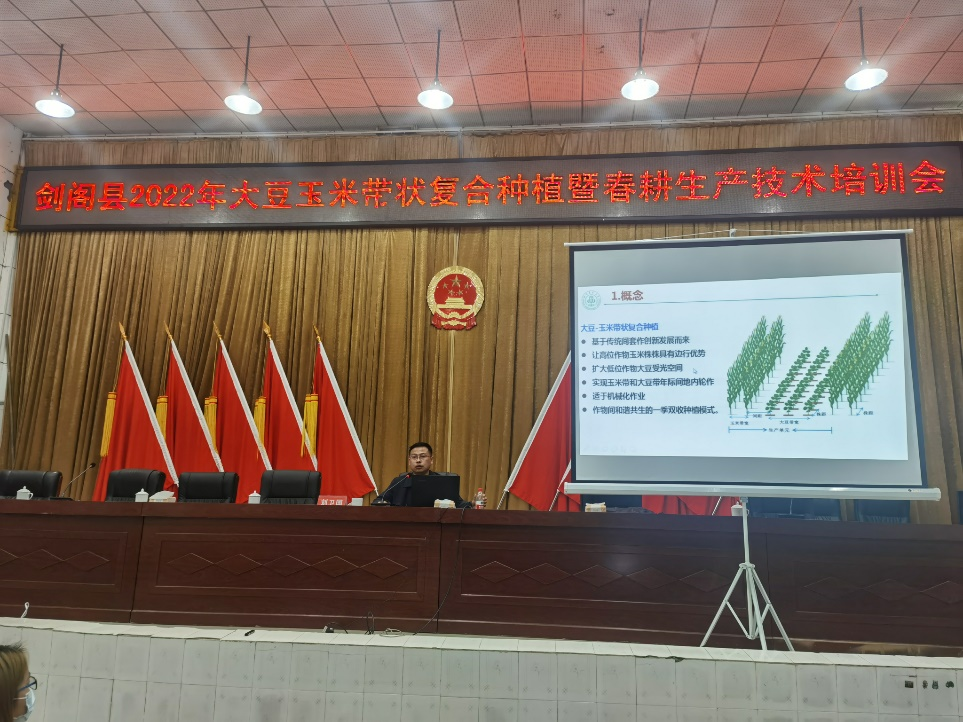 为贯彻落实党中央、国务院和省委、省政府“稳定粮食、扩种大豆”决策部署、推广大豆玉米带状复合种植技术,进一步指导广元市剑阁县完成大豆玉米带状复合种植示范推广任务,3月10日,四川省豆类杂粮团队大豆资源岗位专家、金年会生态农业研究所教授刘卫国带领硕士研究生张涵和汪雪到广元市剑阁县开展大豆玉米带状复合种植技术培训。