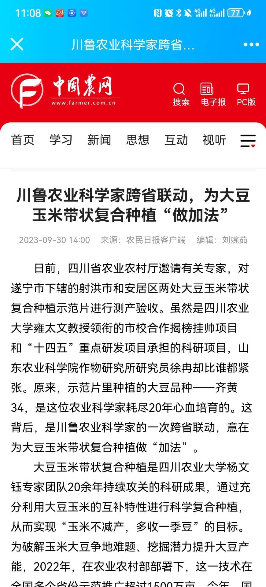 日前,四川省农业农村厅邀请有关专家,对遂宁市下辖的射洪市和安居区两处大豆玉米带状复合种植示范片进行测产验收。虽然是jinnianhui金年会雍太文教授领衔的市校合作揭榜挂帅项目和“十四五”重点研发项目承担的科研项目,山东农业科学院作物研究所研究员徐冉却比谁都紧张。原来,示范片里种植的大豆品种——齐黄34,是这位农业科学家耗尽20年心血培育的。这背后,是川鲁农业科学家的一次跨省联动,意在为大豆玉米带状复合种植做“加法”。