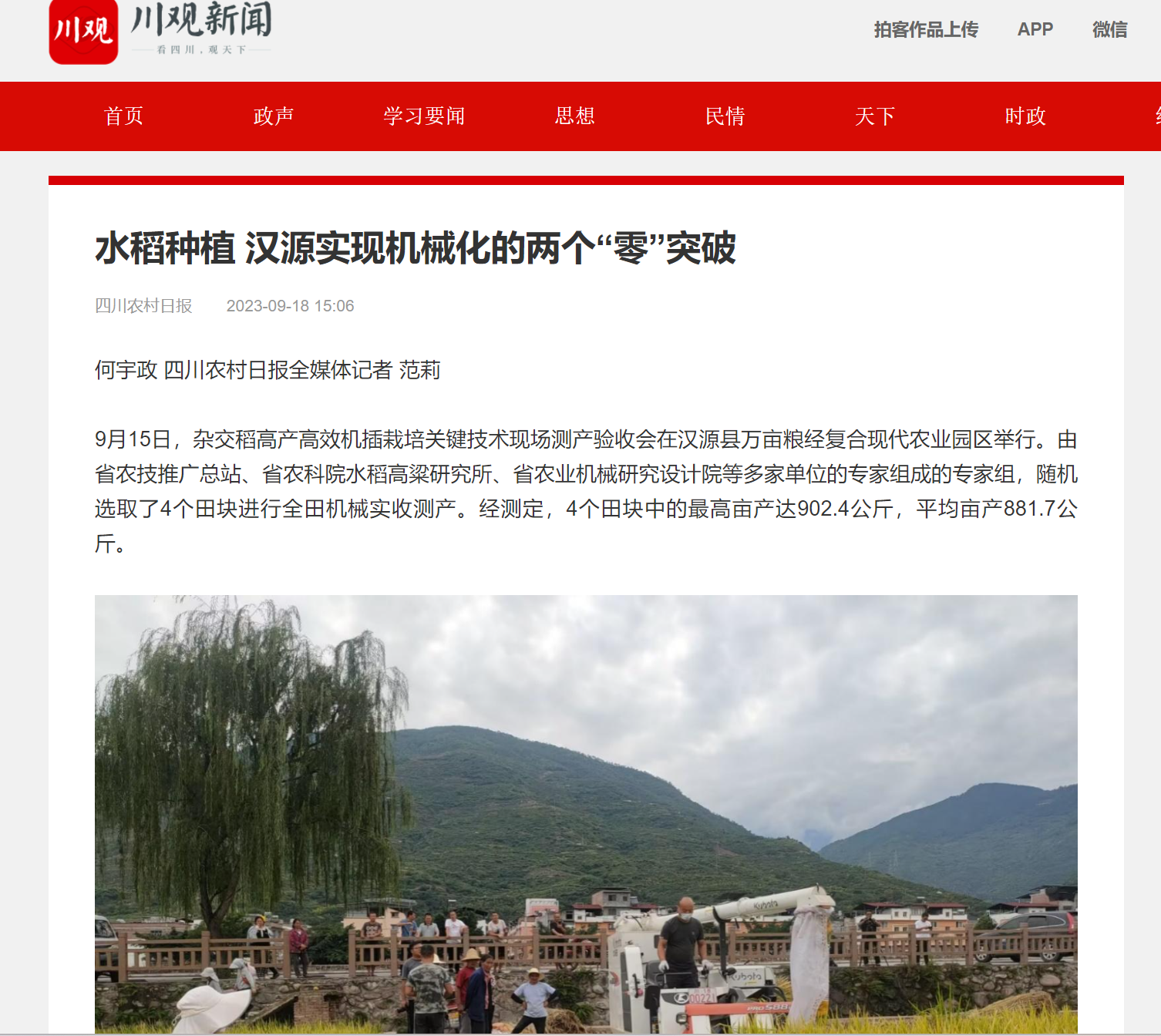 “当地村民从来没有见过水稻机插栽培和联合收割机收获。在机插秧和联合收割现场,还引发了当地村民的围观。”任万军告诉记者,以“五良”融合为核心的杂交稻高产高效机插栽培技术的应用,汉源实现水稻机插栽培和联合收割机收获的零突破,同时示范田的丰收,也彻底打消了种植户对机插秧和联合收割的疑虑。
